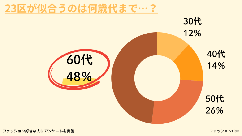23区が似合う年齢層についてアンケートを実施し、20代から60代の男女50人から回答を得ました。