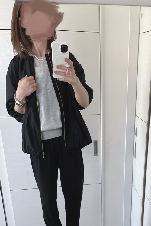 ジップアップでカジュアルに着られるけど、繊細な生地感やボリュームある袖など女性らしくみえる工夫が満載。