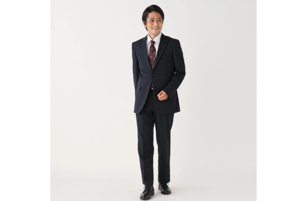 ジャケットはレギュラーシルエット、パンツはノータック仕様で、すっきりとした印象に仕上がっています。
