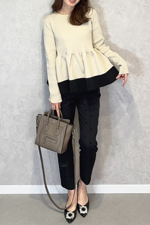 スタイルアップ効果抜群で、カジュアルにもエレガントにも着こなせる、配色スポンジニットペプラムです。
