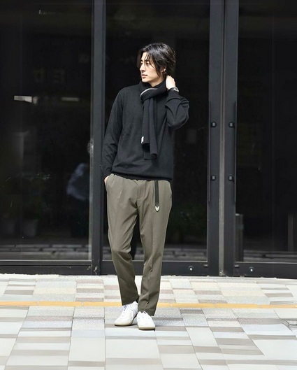 こちらのコーデでは、ニット・スラックスのシンプルコーデにマフラーをプラスしてカジュアルダウン。