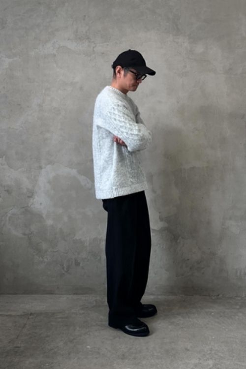 シンプルに見えて立体的な編み目が特徴的なニットは、1枚着るだけで大人の余裕を感じられる休日スタイルに。