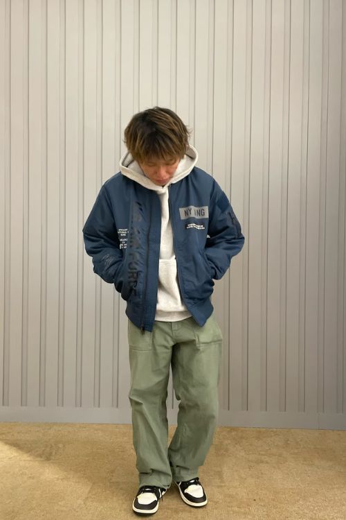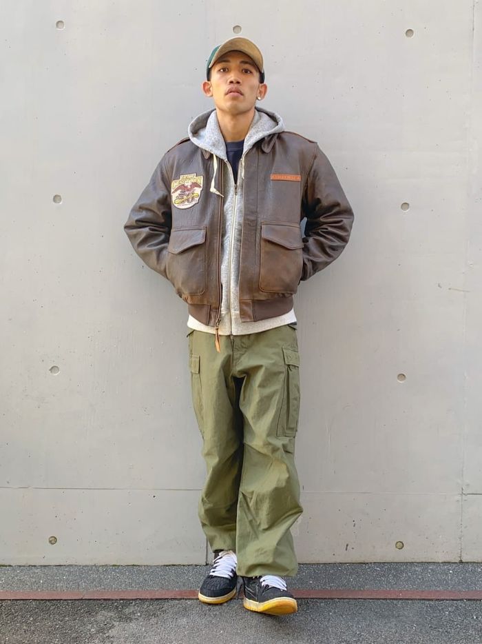 こちらの例では、パーカー+チノパンの定番コーデにアビレックスのブルゾンが際立っています。