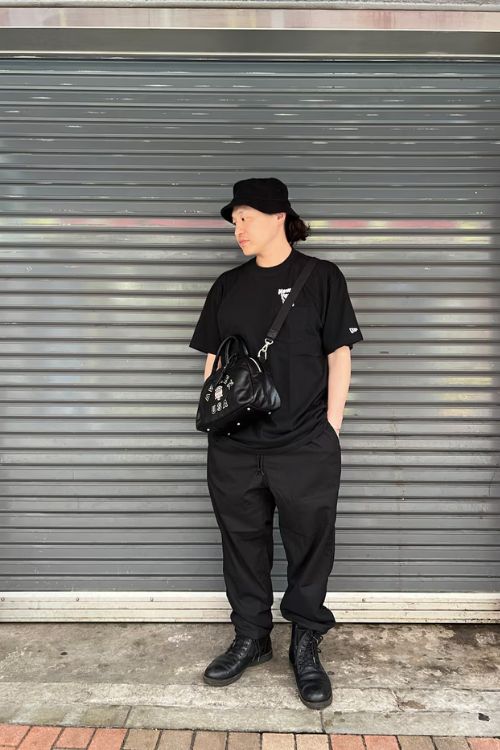 小物まで統一したブラックコーデは、ブランドロゴがアクセントになって遊び心ある着こなし。