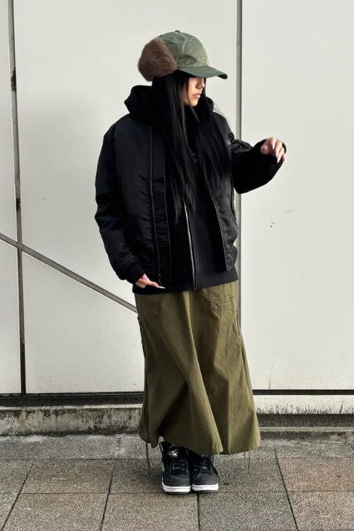 ミリタリー調のロングスカートは、マーメイドシルエットでフェミニンな着こなしもできそう。