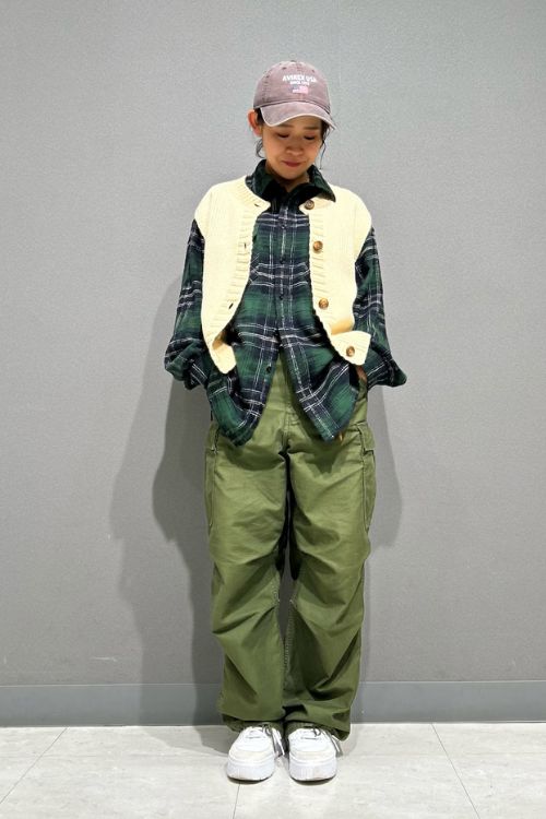 ニットベストとチェックシャツのレイヤードは、トレンド感あるミリタリーテイストに仕上がっています。