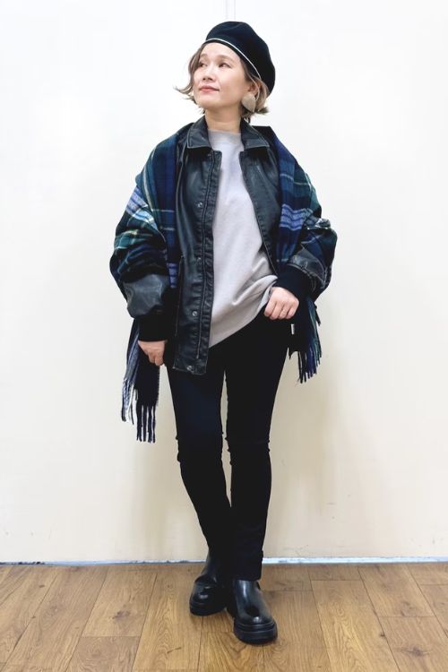 レザージャケットのマニッシュなコーデには、ストールやベレーでこなれ感を出しています。