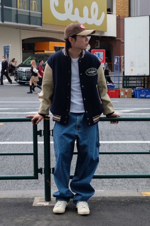 ネイビーのスタジャンは、ビンテージ風の配色でレトロ感とともにマリンカラーのさわやかさも感じられます。