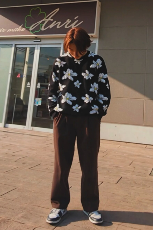 目を引く花柄のニットがアクセントになり、シックなボトムスとよくマッチしています。