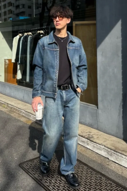 重たくなりがちなジーンズのセットアップですが、きれいめな革靴とさりげないアクセサリーで軽やかな雰囲気に。