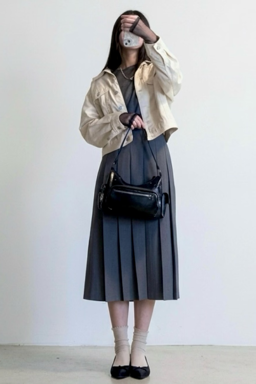 プリーツスカートがきちんと感を出しつつ、靴下とパンプスがレトロなおしゃれを演出しています。