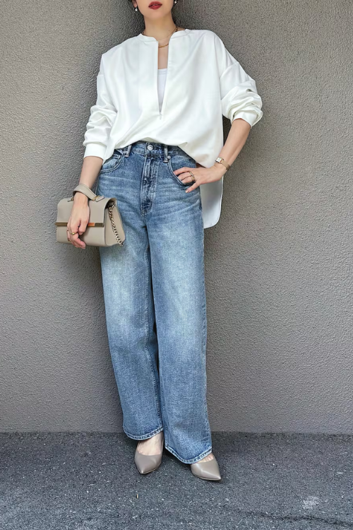 定番の白シャツ×ジーンズの組み合わせですが、きれいめな小物を合わせることで野暮ったくならず洗練された雰囲気に。