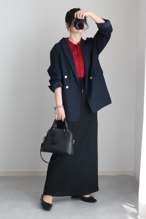 黒を基調とした大人っぽいスタイリングに、赤いシャツがとても洗練されたアクセントになっていますね。