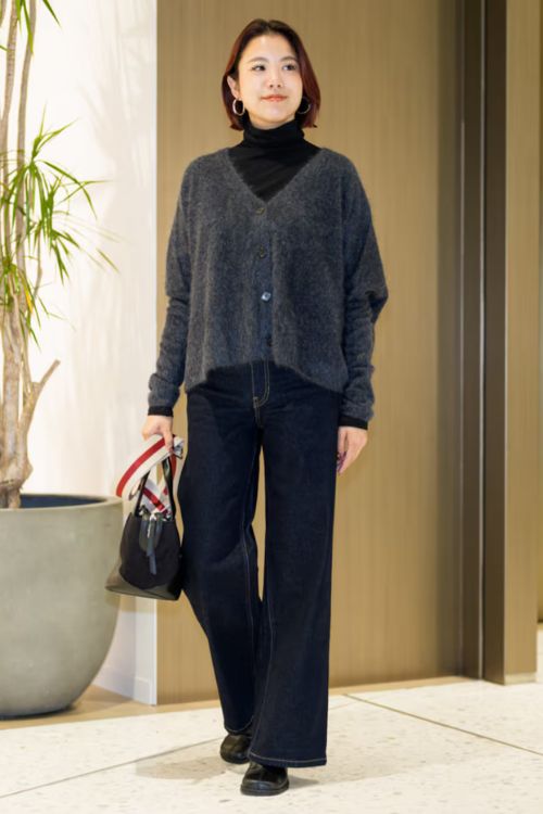モノトーン中心のシックなコーデは、ニットやデニムなど異素材を組み合わせて立体的に仕上がっています。