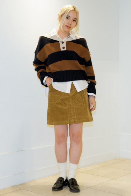 ラガーシャツ柄のセーターに白シャツをレイヤードすると、クラシカルかつトレンド感ある雰囲気です。