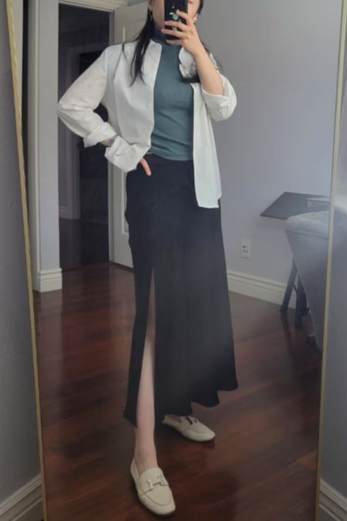 ボトムスはシンプルに、トップスや小物でアクセントをつけて、上品さとセンスのよさが感じられますね。