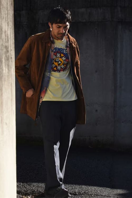遊び心あるインナーのプリントTシャツとの対比で、ワイルドなレザーコートの渋さが引き立っていますね。