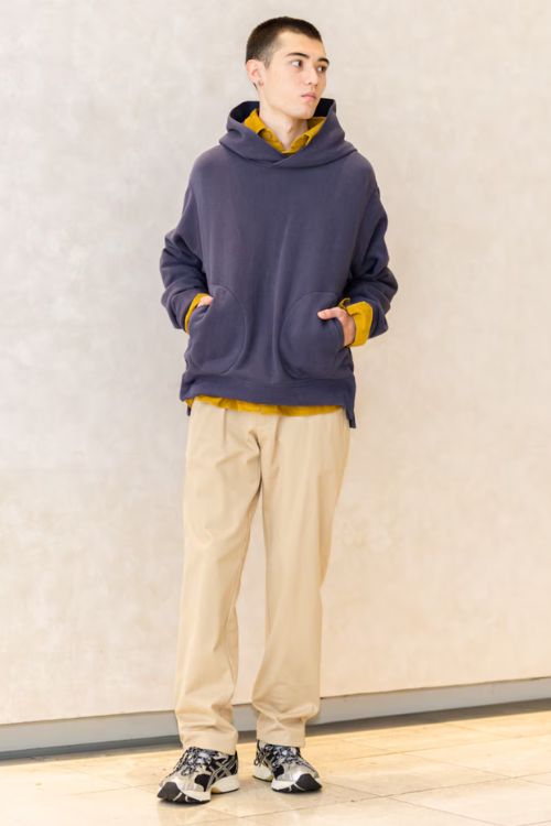 パーカー+チノパンのシンプルな組み合わせは、中に重ねたイエロー系のシャツがアクセントになっています。