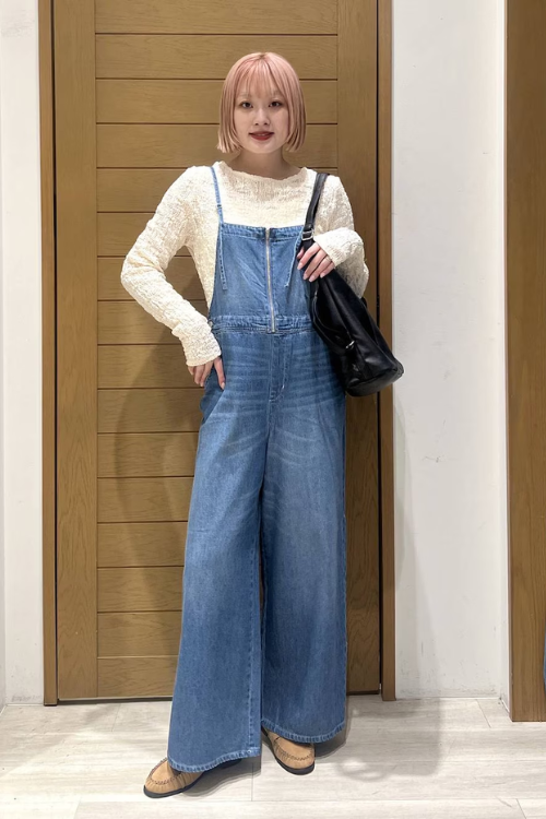 野暮ったくなりやすいサロペットですが、さわやかで個性的な生地感のトップスを合わせることでこなれ感をプラス。