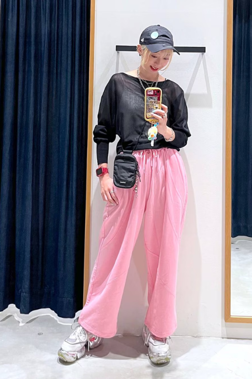 少しシアー感があるトップスと目を引くカラーの組み合わせで、女性らしくてかわいらしいコーデになっています。