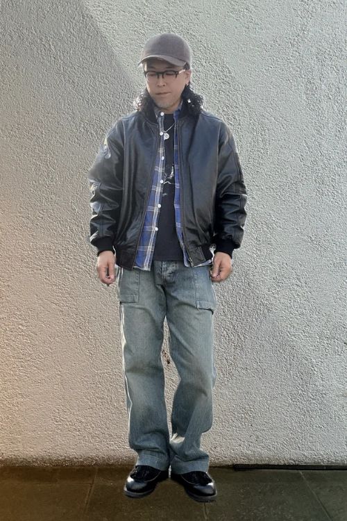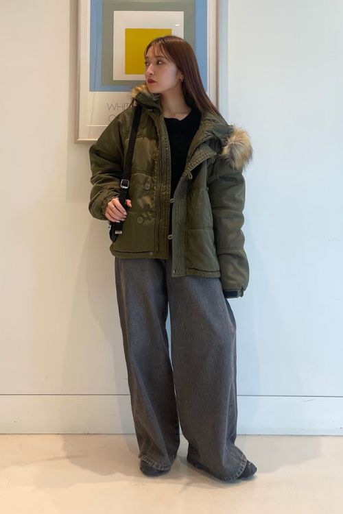 メンズのブルゾンを取り入れたコーデは、たっぷりのファーがゴージャスで、ワイドデニムとも相性ぴったり。
