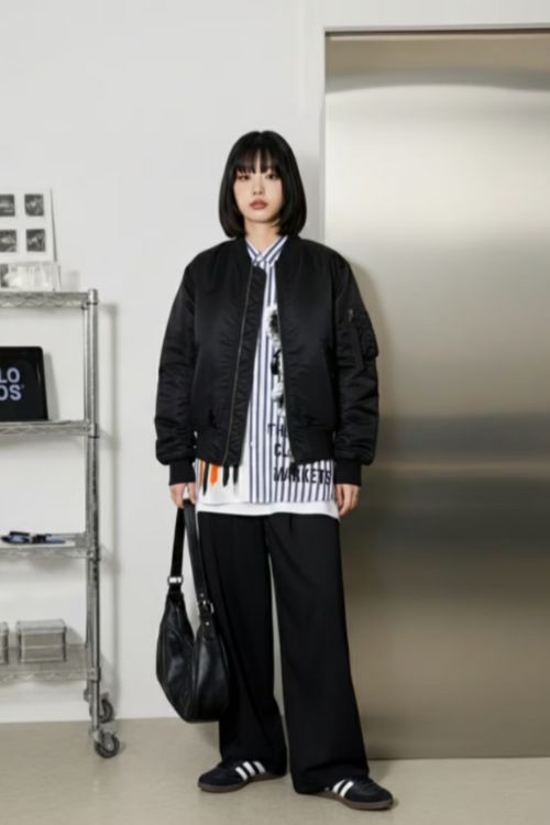 存在感あるストライプシャツを主役に、ほかは黒で統一してモードな雰囲気にまとまっています。