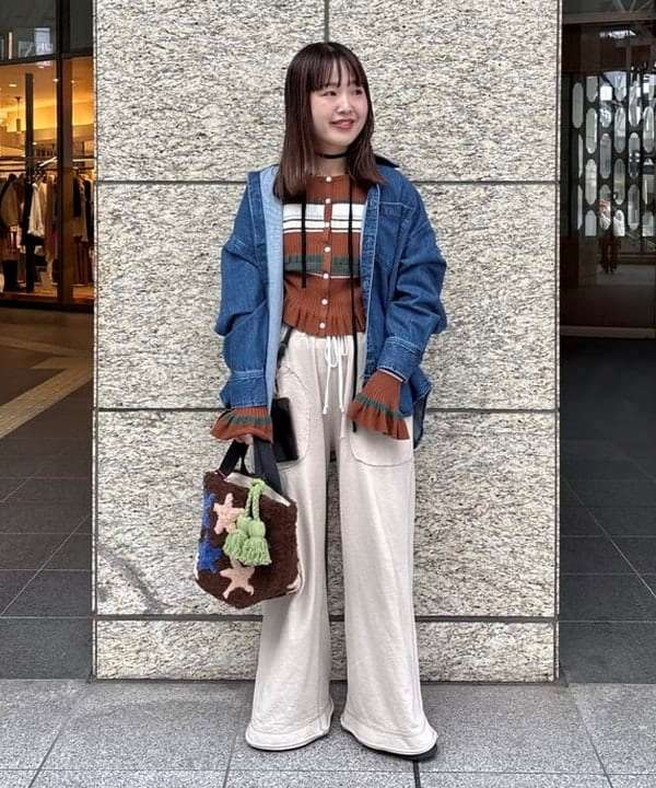 こちらのコーデは、フリルがかわいいボーダーニットを、デニムシャツや無地のパンツで引き立てています。
