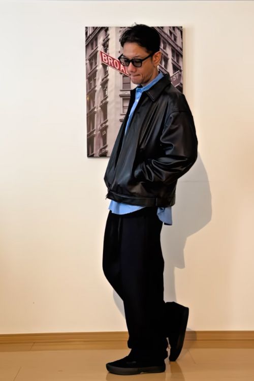 すっきりしたデザインのレザーブルゾンは都会的な印象で、カジュアルにもきれいめにも似合いそう。