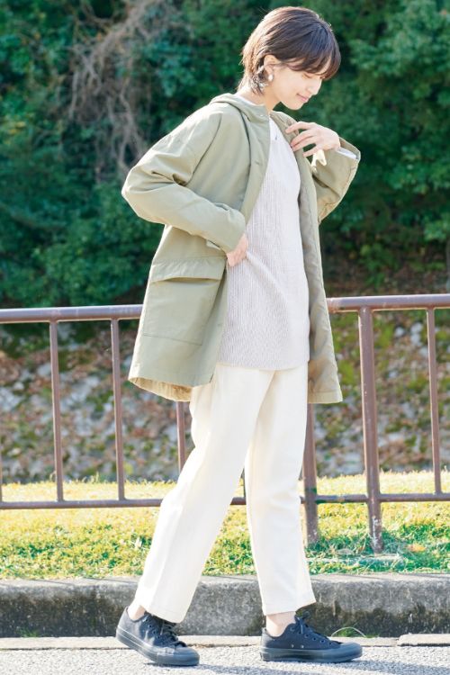 スタンドカラー・比翼仕立てのすっきりしたデザインで、インナーをのぞかせたレイヤードスタイルもおすすめです。