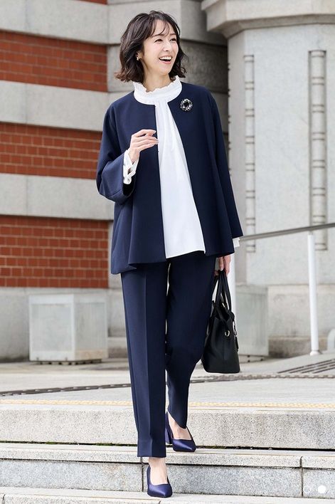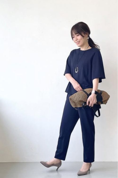 上品なネイビーのセットアップは、アクセサリーやナチュラル素材のバッグで上手にカジュアルダウンしていますね。
