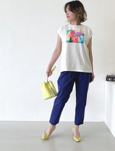 こちらの例では、イエロー系のバッグとパンプスで、シンプルなTシャツスタイルが一気にあか抜けた雰囲気に。