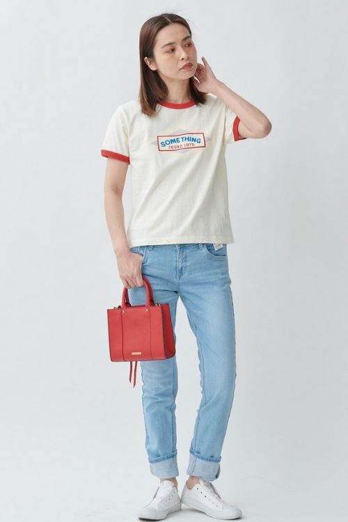 Tシャツのパイピングとバッグの赤をリンクさせたコーデは、レトロな雰囲気がかわいいですね。
