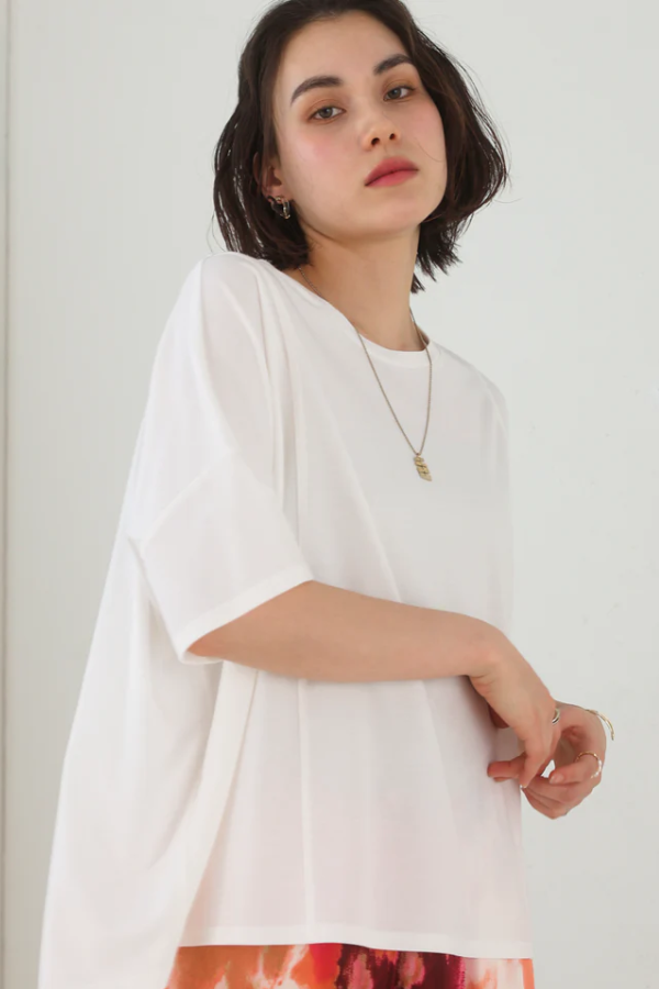 着やせ効果抜群な素材でゆったりとした着心地な、クリアクールワイドシルエットプルオーバーです。