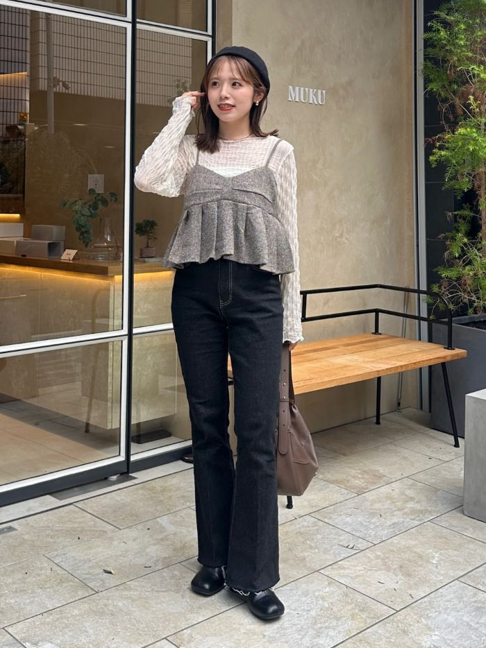 シアーなチュールと細リボンが繊細な印象で、デニムとあわせた甘辛Mixコーデもおすすめです。