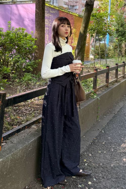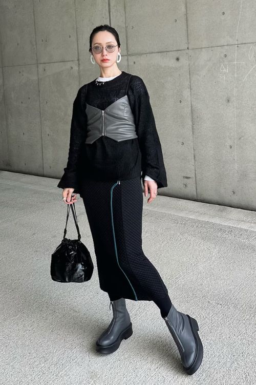 異素材を重ねることで、1色だけでも単調にならず、ビスチェの存在感がなじんで上品な印象になっています。