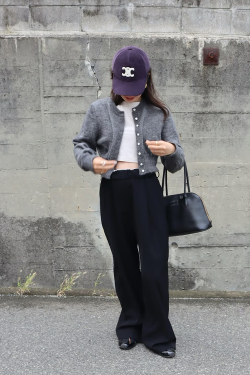 きれいめスタイルにキャップを合わせても、雰囲気を崩しすぎずに高級感がプラスされています。
