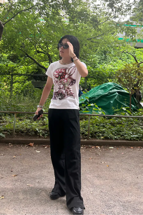 セリーヌの中では異彩を放つようなデザインのTシャツは、シンプルなコーデと合わせて抜群の存在感に。