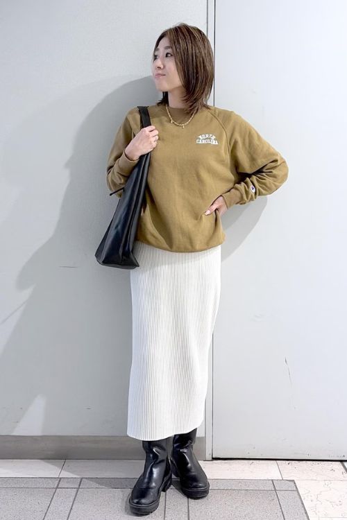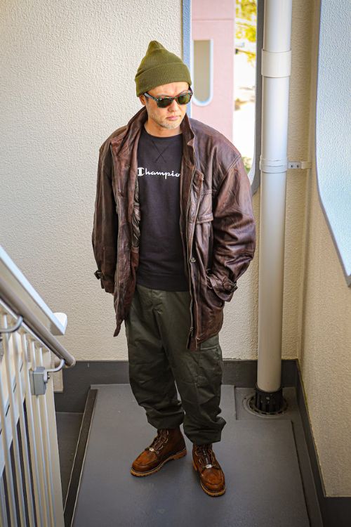 ベーシックなフォルムのスウェットは、無骨なミリタリージャケットとも相性ぴったりです。