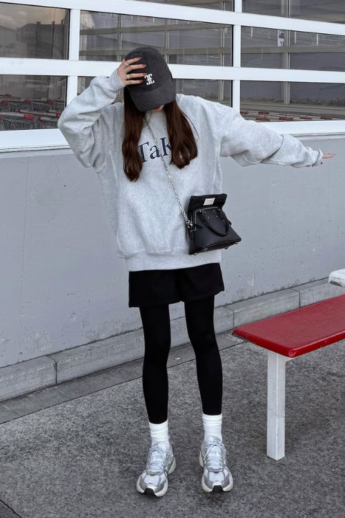 オーバーサイズのスウェットとショートパンツのコーデは、ガーリーだけどモノトーンでまとめて大人っぽく。
