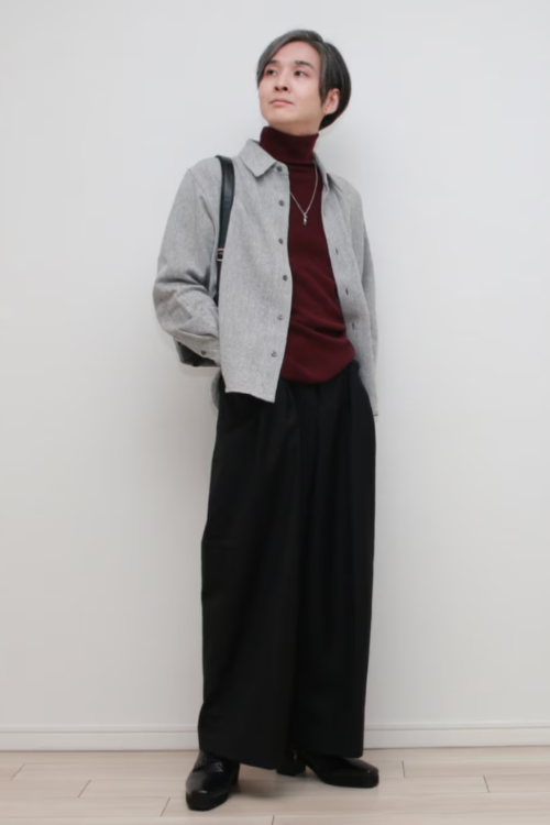 しっかりとしすぎそうなシャツジャケットも、タートルネックとアクセサリーで程よく遊びが演出されていますね。