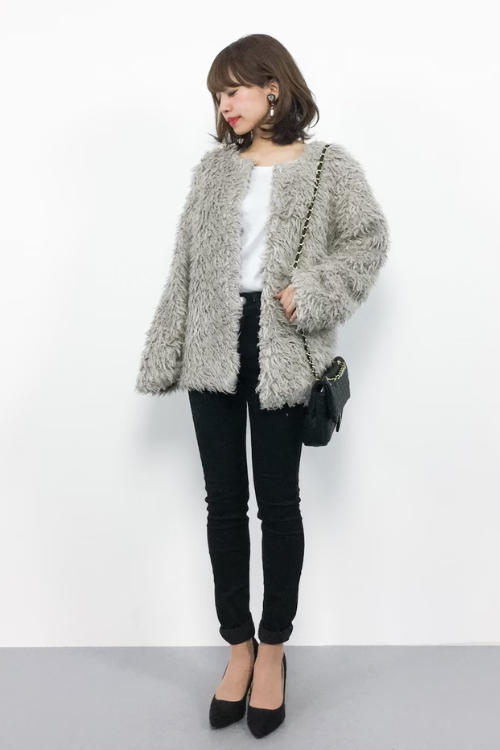 表はボア、裏は光沢感のあるブラックの生地を使用しており、気分に合わせて着こなせるうれしい仕様。
