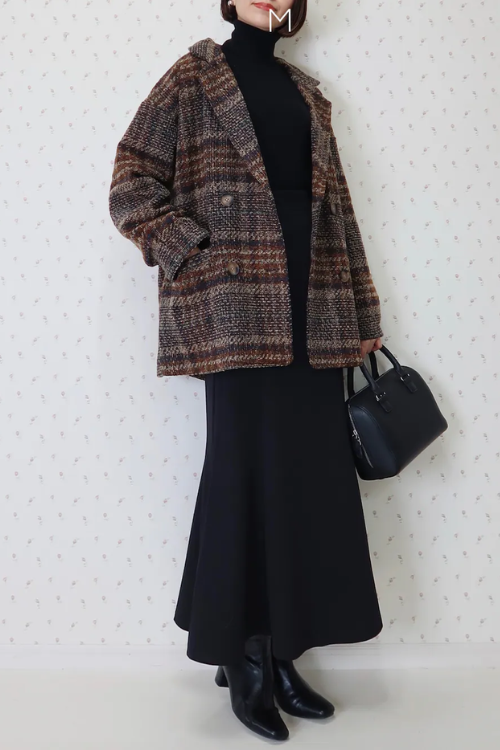 オールブラックコーデでしっとりと魅せつつ、柄のあるコートを羽織ることで縦ラインが強調されスタイルアップ効果も。