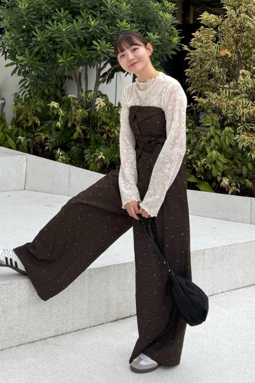 一見カジュアルなコーデに見せつつ、トップスのレース素材が、女性らしさとちょっとした特別さを感じますね。