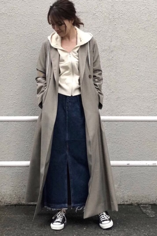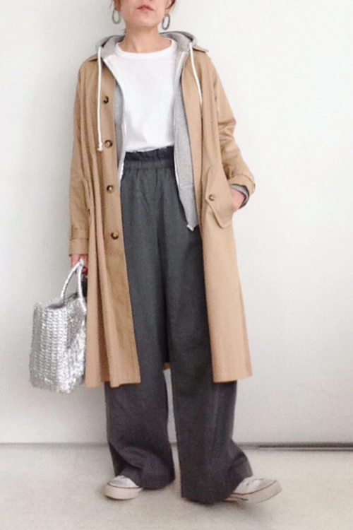 コートで縦長シルエットを作りつつパーカーでラフさを加え、さりげない可愛さも演出できるのが魅力なんですね。