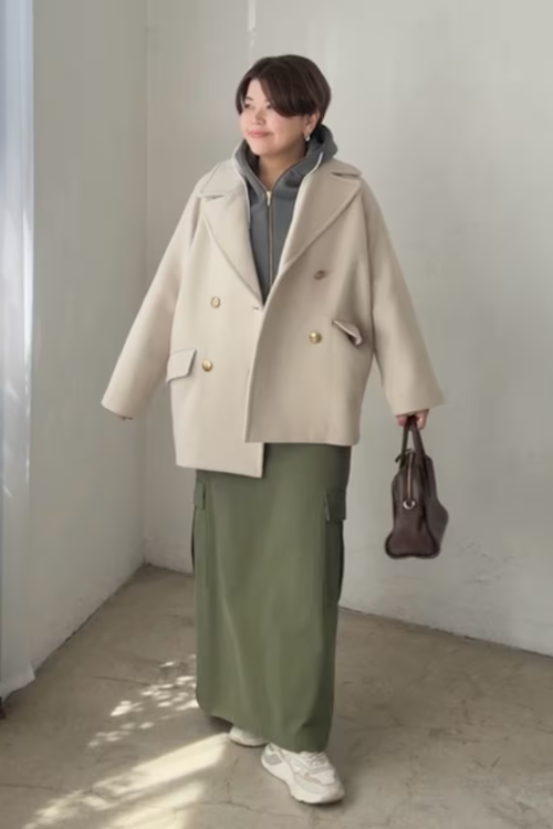 ロングコートにパーカーを合わせたレイヤードは、縦長シルエットが強調され、低身長でもバランスよく見えるのが魅力。