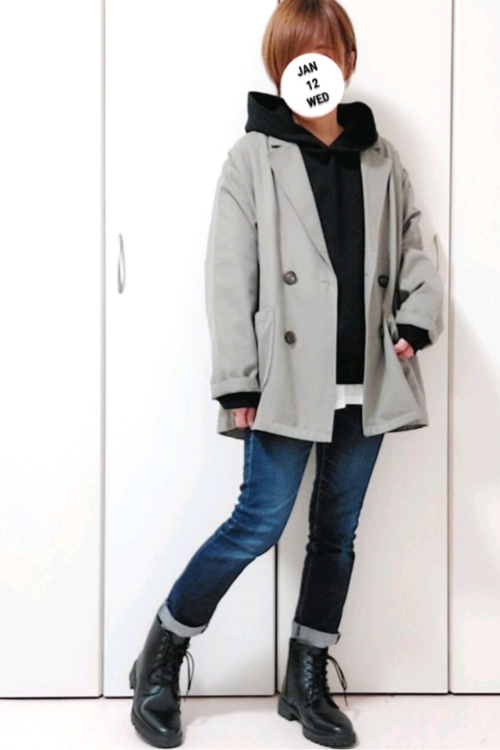 コートで縦長の大人なシルエットを出し、パーカーでカジュアルさを足して素材とシルエットの質感差がおしゃれな感じがします。