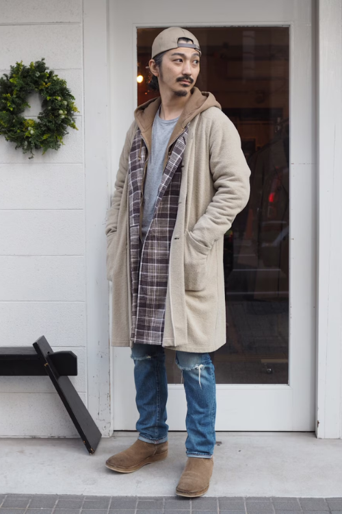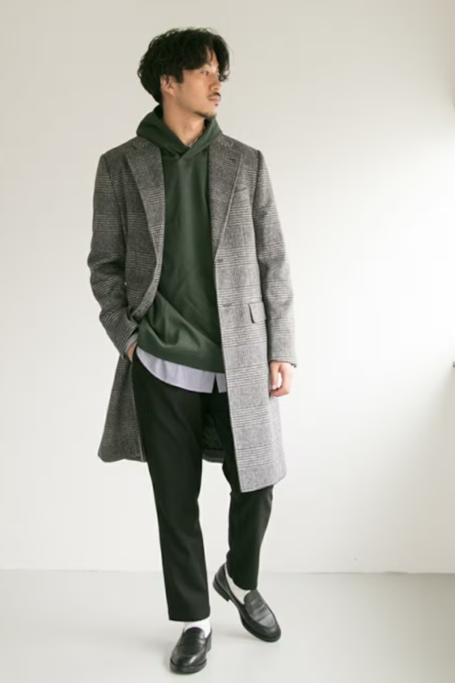 縦長シルエットを意識したコートにパーカーを合わせ、さらにインナーにシャツを入れることで、カジュアルさを保ちながらもきちんと感がある着こなしです。