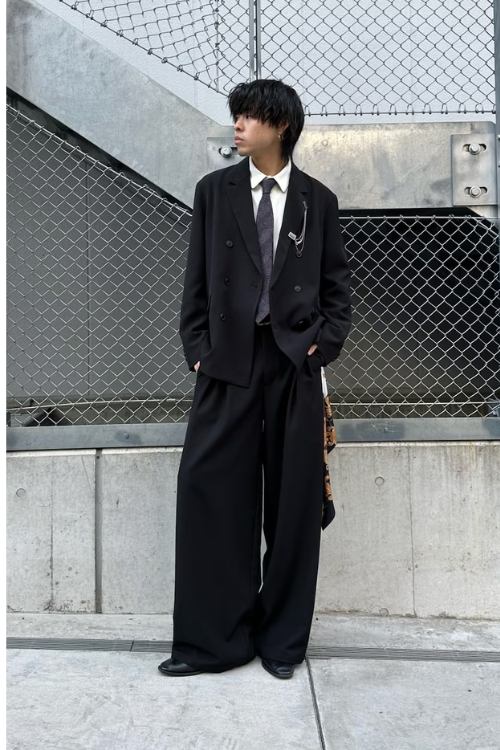 オーバーサイズのボトムスはカジュアル感が出すぎることもありますが、ジャケットとネクタイが程よくコーデを引き締めています。