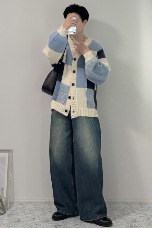 シンプルなジーンズに、かわいらしさも感じる爽やかなカーディガンが、とてもよく映えていますね。
