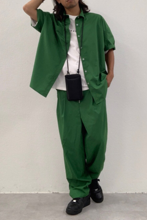 目を惹くカラーのセットアップながら、大人っぽいグリーンを使用することで、ビビットになりすぎず落ち着いた印象に。